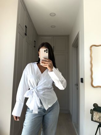 Bağlama detaylı, poplin gömlek. Kruvaze model. Modeldeki beden S. Model Boy:169 Kilo:58